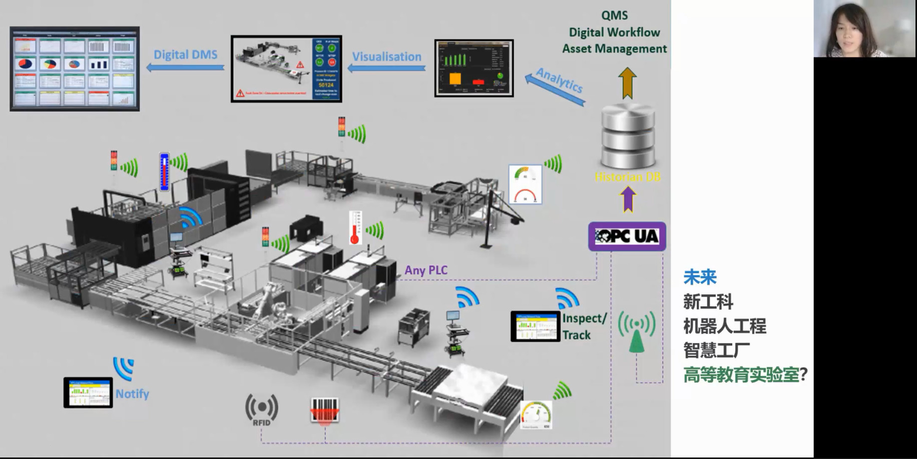 賈敏圍繞數(shù)字孿生、智造創(chuàng)新和桌面智慧工廠等相關(guān)技術(shù),針對工業(yè)4.0時代的未來智慧工廠形態(tài)進行了詳細的介紹。她強調(diào),未來智慧工廠將會是實體物理環(huán)境和虛擬網(wǎng)絡(luò)世界的深度融合,也是一個“數(shù)字孿生”的人機交互系統(tǒng),更將是新工科人才的主要聚集地。