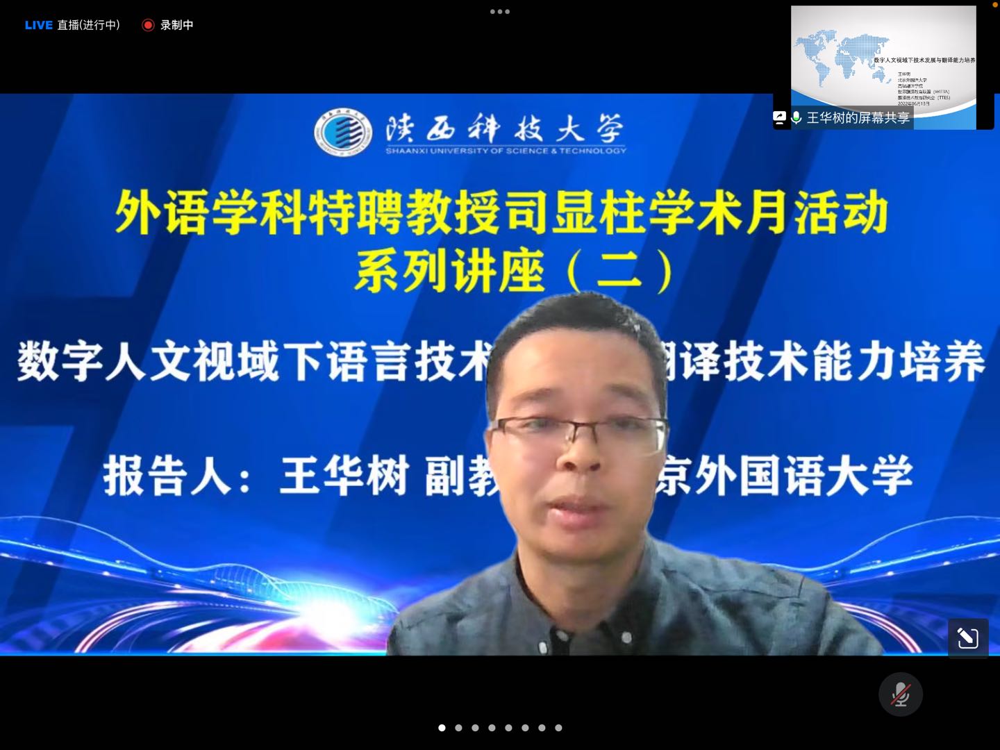6月13日,北京外國語大學(xué)王華樹博士應(yīng)邀做客我?!拔囱雽?dǎo)師論壇”,作為外語學(xué)科特聘教授司顯柱學(xué)術(shù)月活動系列講座第二位主講嘉賓,做了題為“數(shù)字人文視域下語言技術(shù)發(fā)展與翻譯技術(shù)能力培養(yǎng)”的線上報告。文理學(xué)院院長劉建科致歡迎辭,他對專家提供的寶貴學(xué)習(xí)機會表示感謝,也充分肯定了近年來我校外語學(xué)科在前沿專家們的引領(lǐng)下所取得的長足進步,他指出,本次學(xué)術(shù)月活動的宗旨在于加強我校師生與領(lǐng)域?qū)<业膶υ捊涣?。文理學(xué)院副院長李穩(wěn)敏開場主持,報告由文理學(xué)院外語系英語專業(yè)教研室主任李海亭主持,外語師生100余人聆聽了此次報告。文理學(xué)院6月組織開展的外語學(xué)科特聘教授司顯柱學(xué)術(shù)活動系列講座,旨在充分發(fā)揮我校特聘教授學(xué)術(shù)引領(lǐng)和資源共享作用,推動我校外語學(xué)科內(nèi)涵發(fā)展。