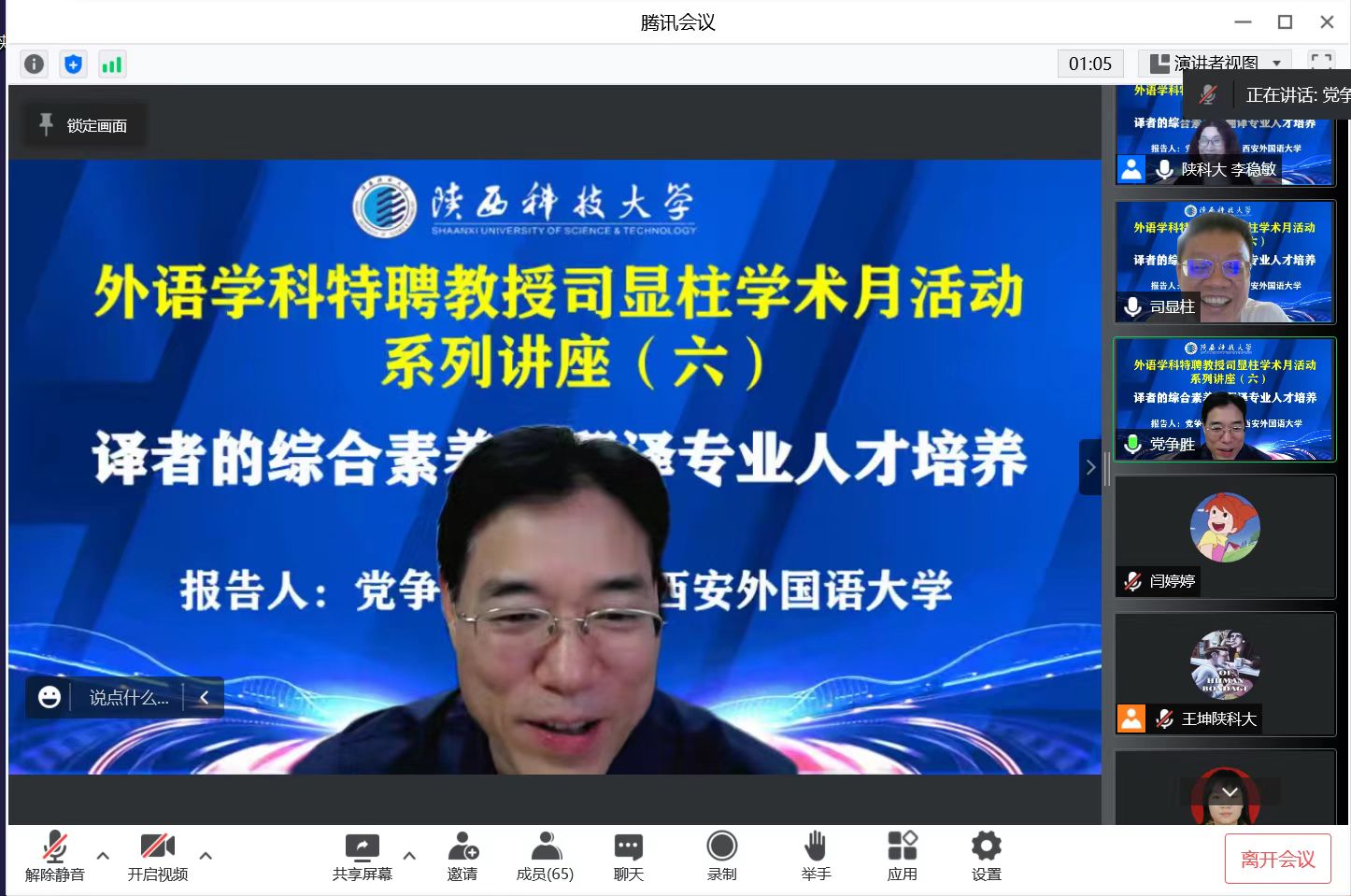 6月24日,西安外國(guó)語(yǔ)大學(xué)副校長(zhǎng)黨爭(zhēng)勝作客我校“前沿科學(xué)報(bào)告”,作了題為“譯者的綜合素養(yǎng)與我國(guó)翻譯專(zhuān)業(yè)人才培養(yǎng)”的線(xiàn)上報(bào)告。報(bào)告由我校外語(yǔ)學(xué)科特聘教授司顯柱主持,外語(yǔ)師生約200人聆聽(tīng)了此次報(bào)告。文理學(xué)院6月組織開(kāi)展的外語(yǔ)學(xué)科特聘教授司顯柱學(xué)術(shù)活動(dòng)系列講座,旨在充分發(fā)揮我校特聘教授的學(xué)術(shù)引領(lǐng)和資源共享作用,推動(dòng)我校外語(yǔ)學(xué)科內(nèi)涵發(fā)展。