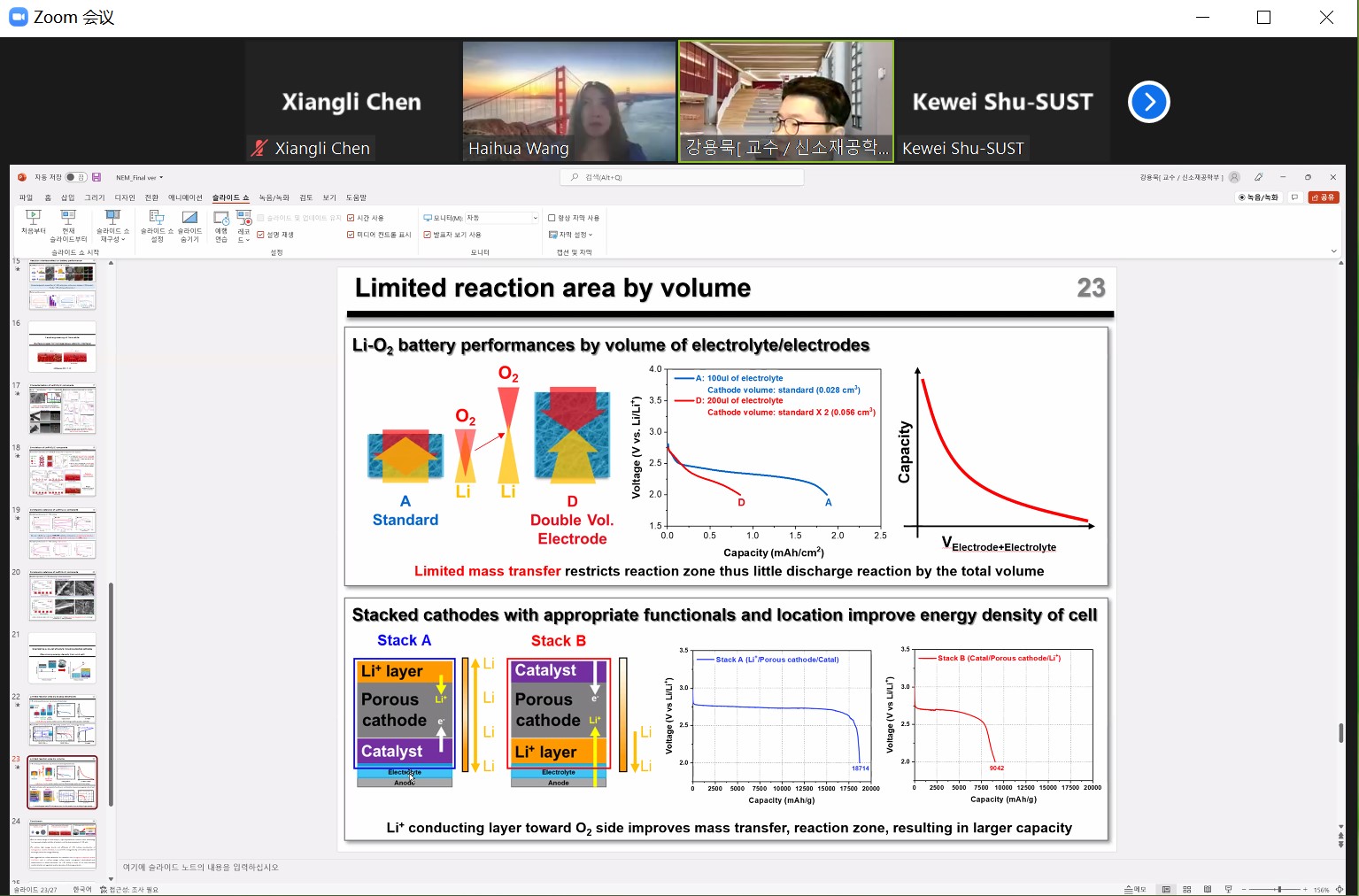 YongMook Kang(姜龍默)教授從Li-O2電池由于其理論比能量高達(dá)11140 Wh/kg,可以取代鋰離子二次電池的研究背景出發(fā),為了正確開發(fā)鋰氧電池,考慮從其表面能、微觀結(jié)構(gòu)和電子結(jié)構(gòu)變化,闡述了用于催化的固體催化劑設(shè)計,因為這些參數(shù)會影響Li2O2和其他放電產(chǎn)物的行為,最終決定電化學(xué)性能,詳細(xì)介紹了固體過氧化氫酶的設(shè)計原則。報告最后,姜龍默教授與師生們進(jìn)行交流討論,現(xiàn)場氣氛熱烈。
