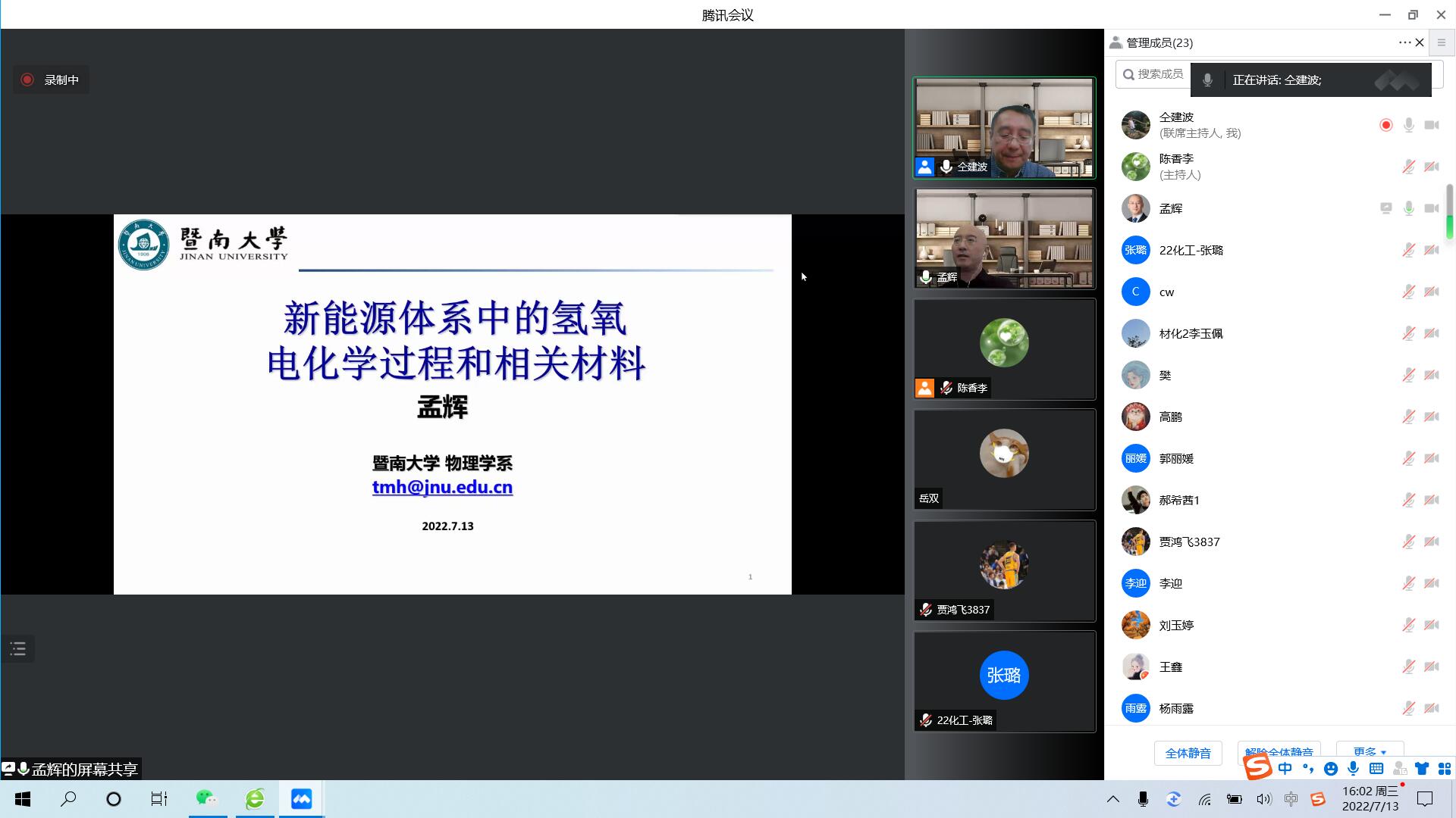 應(yīng)研究生院及化學(xué)與化工學(xué)院邀請,蘭州大學(xué)翟紅林教授和暨南大學(xué)孟輝教授分別于7月11日和13日做客我校“未央導(dǎo)師論壇”,分別做了題為“基于化學(xué)圖譜的定量分析新進(jìn)展”和“新能源體系中的氫氧電化學(xué)過程和相關(guān)材料”的報告。報告會由化工學(xué)院副院長仝建波教授主持,學(xué)院相關(guān)專業(yè)教師、研究生聆聽了此次報告會。