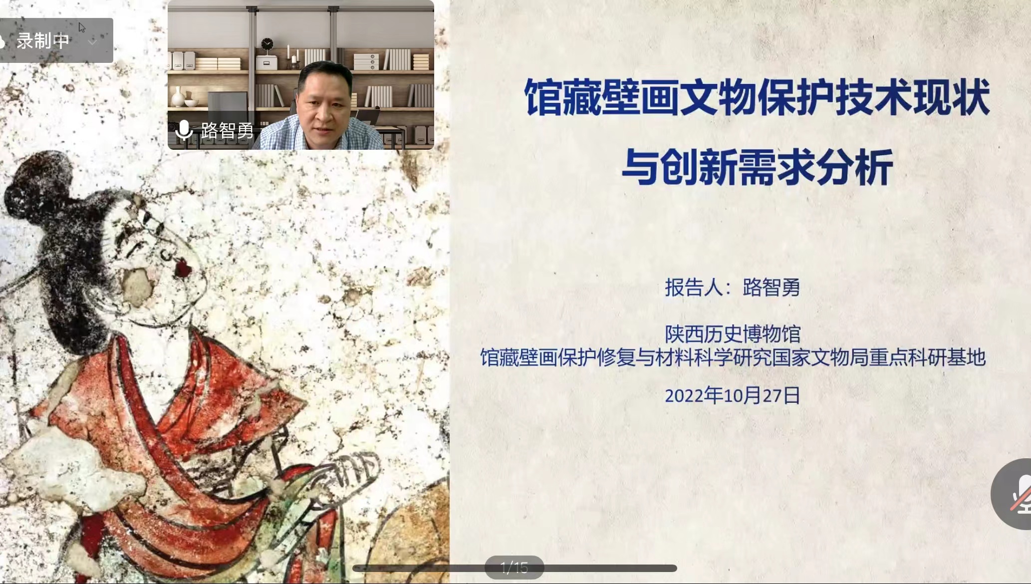 10月27日,應(yīng)我校科技處、材料科學(xué)與工程學(xué)院(文物保護(hù)科學(xué)與技術(shù)學(xué)院)邀請,陜西歷史博物館路智勇研究員做客我?!扒把乜茖W(xué)報(bào)告”,作了題為“館藏壁畫保護(hù)技術(shù)現(xiàn)狀與創(chuàng)新需求分析”的線上學(xué)術(shù)報(bào)告。報(bào)告由材料學(xué)院院長朱建鋒教授主持,學(xué)院相關(guān)領(lǐng)域教師和研究生參加了此次報(bào)告會。