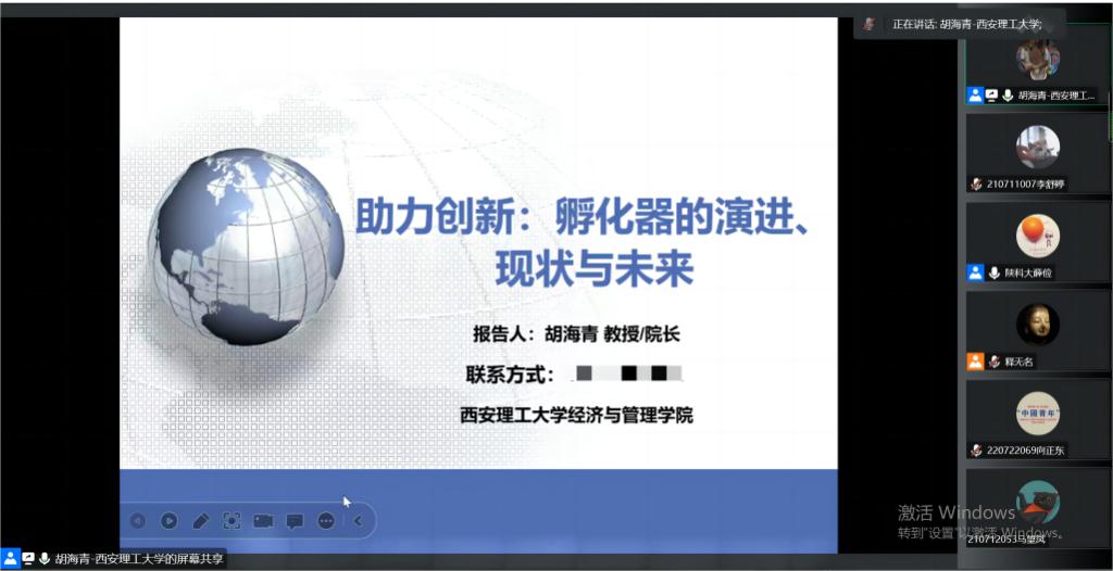 11月8日,受科技處、經(jīng)濟與管理學(xué)院邀請,西安理工大學(xué)經(jīng)濟與管理學(xué)院院長胡海青教授做客我?!扒把乜茖W(xué)報告”,為我校師生帶來主題為“助力創(chuàng)新:孵化器的演進、現(xiàn)狀與未來”的線上報告。報告由經(jīng)管學(xué)院副院長薛儉教授主持,經(jīng)管學(xué)院教師、研究生聆聽了此次報告。
