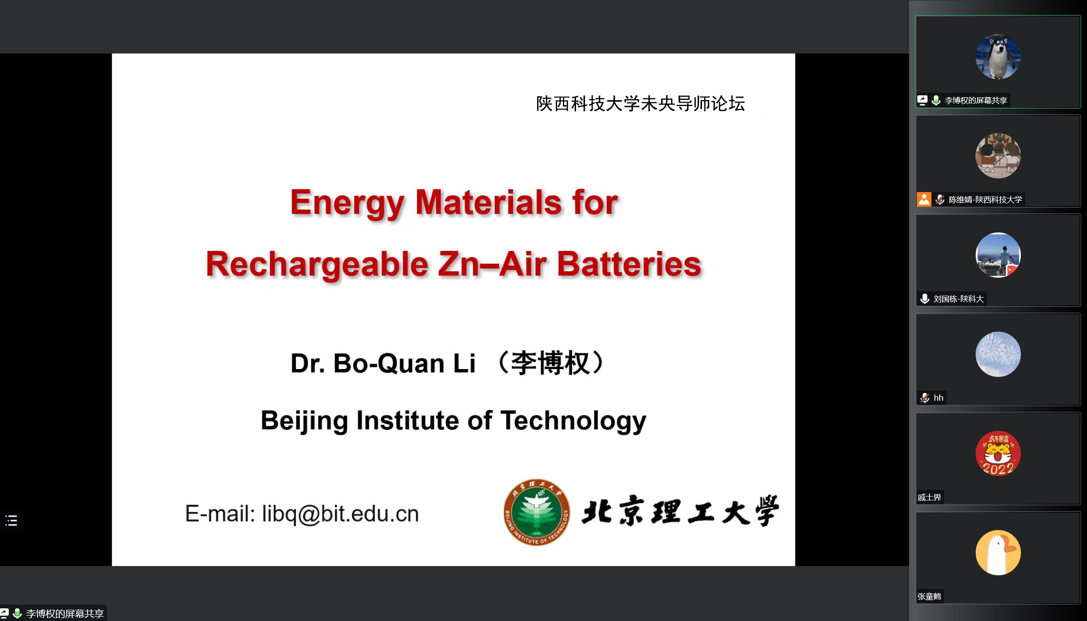 11月17日,應(yīng)我校柔性電子學(xué)院和研究生院邀請(qǐng),北京理工大學(xué)李博權(quán)副研究員做客我校“未央導(dǎo)師論壇”,作了題為“二次鋅空氣電池的多相界面設(shè)計(jì)與調(diào)控”的線上學(xué)術(shù)報(bào)告。報(bào)告會(huì)由柔性電子學(xué)院副院長(zhǎng)劉國(guó)棟主持,相關(guān)專(zhuān)業(yè)教師和研究生參加了此次報(bào)告會(huì)。
