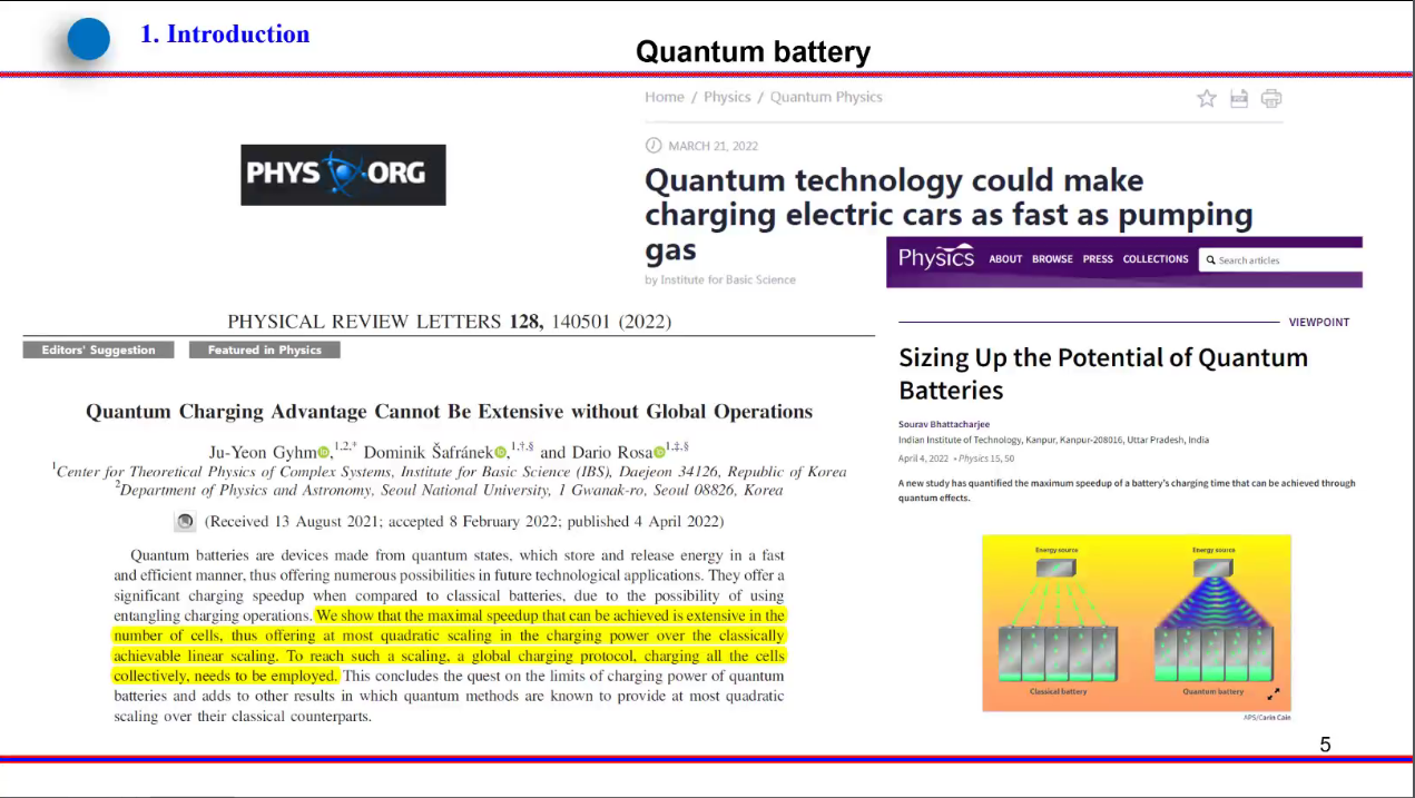 本報(bào)告在介紹量子電池基本概念、研究背景以及研究現(xiàn)狀的基礎(chǔ)上,重點(diǎn)介紹報(bào)告人所在課題組最近在該領(lǐng)域的幾個(gè)研究工作:1)擴(kuò)展Dicke量子電池,構(gòu)建了具有原子間相互作用與外場(chǎng)驅(qū)動(dòng)的腔量子電池——擴(kuò)展Dicke量子電池模型,分析了電池性能,發(fā)現(xiàn)最大存儲(chǔ)能量有一個(gè)臨界行為,獲得了對(duì)應(yīng)的臨界相互作用,進(jìn)一步分析了該電池的量子優(yōu)勢(shì),獲得了最大存儲(chǔ)能量、能量量子漲落以及最大平均功率與原子數(shù)之間的關(guān)系,發(fā)現(xiàn)最大充電功率的量子優(yōu)勢(shì)滿足一個(gè)超線性關(guān)系,通過(guò)調(diào)控腔與原子間耦合、原子間相互作用以及驅(qū)動(dòng)場(chǎng)強(qiáng)度等可實(shí)現(xiàn)高效的充電過(guò)程;2)腔Heisenberg-自旋鏈量子電池,提出了腔Heisenberg-自旋鏈量子電池模型,相比于自旋鏈量子電池,其性能明顯提升,最大充電功率的量子優(yōu)勢(shì)中標(biāo)度指數(shù)能達(dá)到2,借助Wigner函數(shù)、von Neumann熵以及負(fù)值度等分析了量子糾纏在該量子電池中的作用。