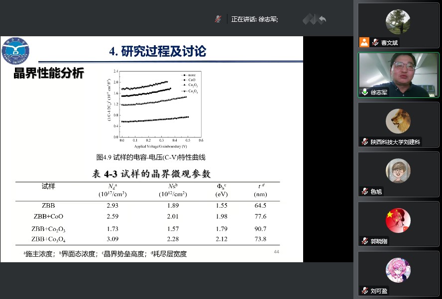 報告中,徐志軍教授從ZnO基壓敏陶瓷的基本概念、研究背景和研究現(xiàn)狀出發(fā),詳細(xì)分析了其缺陷特征和導(dǎo)電機(jī)理。在此基礎(chǔ)上,以制備純銀內(nèi)電極多層片式ZnO基壓敏陶瓷器件為研究目標(biāo),重點(diǎn)介紹了報告人所在課題組近幾年在低溫?zé)Y(jié)低壓高性能ZnO基壓敏陶瓷方面所做的工作。通過添加燒結(jié)助劑來降低壓敏陶瓷的燒結(jié)溫度,但燒結(jié)溫度降低的同時,由于摻雜劑與ZnO之間會發(fā)生化學(xué)反應(yīng),導(dǎo)致晶界氧空位含量較低,從而影響了晶界吸附氧的傳輸,不利于晶界雙肖特基勢壘的提高及非線性電學(xué)性能的優(yōu)化?;诖耍n題組進(jìn)行了預(yù)合成富鉍相摻雜,實(shí)驗(yàn)表明,這在加快液相傳質(zhì),促進(jìn)缺陷反應(yīng),減少氧空位消耗,提高晶界勢壘,改善ZnO基壓敏陶瓷的非線性系數(shù)等電學(xué)性能方面效果明顯。