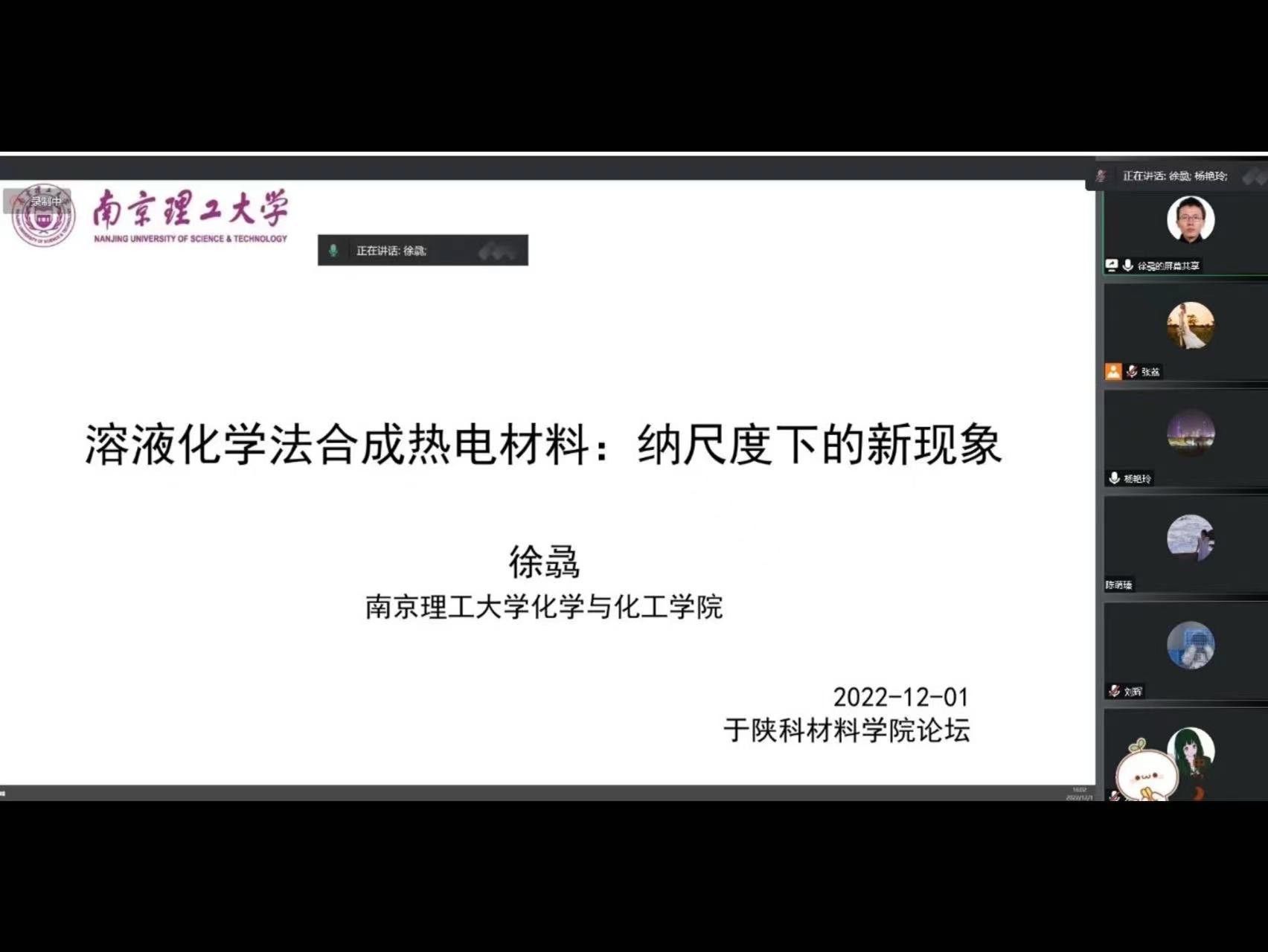 應(yīng)我校材料科學(xué)與工程學(xué)院、科技處及前沿院邀請(qǐng),西安交通大學(xué)肖鈺研究員、南京理工大學(xué)徐骉教授分別于11月28日、12月1日做客我?!扒把乜茖W(xué)報(bào)告”,分別為我校師生帶來(lái)主題為“近室溫鉛硫族熱電材料”“溶液化學(xué)法合成熱電材料:納尺度下的新現(xiàn)象”的線上學(xué)術(shù)報(bào)告,報(bào)告會(huì)由材料學(xué)院副院長(zhǎng)王卓教授主持,材料學(xué)院相關(guān)專業(yè)教師及研究生參加了報(bào)告會(huì)。