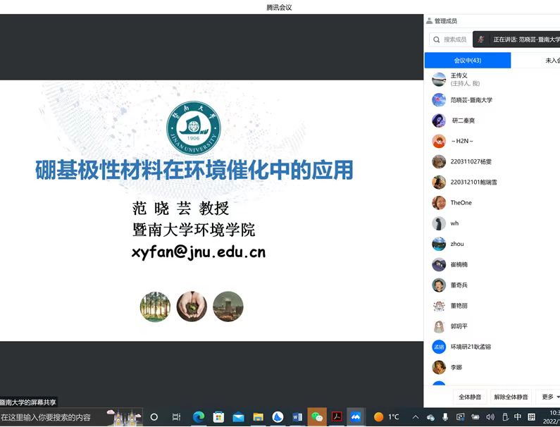12月6日,應我校科技處、研究生院、環(huán)境科學與工程學院邀請,浙江海洋大學周英棠教授、暨南大學范曉蕓教授做客我?!把芯可鷮W術月”活動暨“未央導師論壇”,同時基于趙進才院士工作室、西北生態(tài)環(huán)境材料與技術創(chuàng)新引智基地以及生態(tài)環(huán)境材料與綠色低碳技術國際科技合作基地開展學術交流。兩位教授分別作了題為“相結材料在催化、檢測及腫瘤治療中的研究與探討”“硼基極性材料在環(huán)境催化中的應用”的線上學術報告,相關教師、研究生200余人參加會議。環(huán)境學院學術院長王傳義教授主持會議。