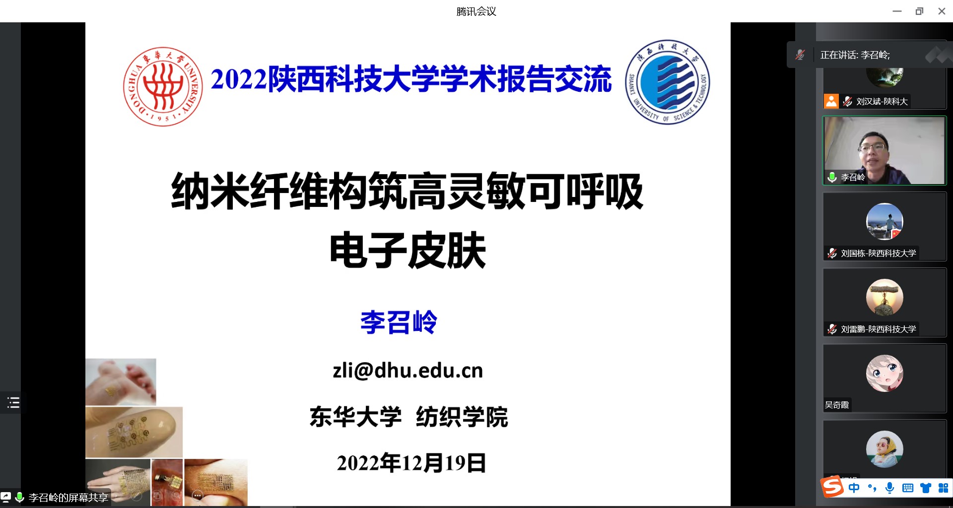 近日,應(yīng)我校輕工科學(xué)與工程學(xué)院(柔性電子學(xué)院)、科技處及前沿院邀請(qǐng),哈爾濱工業(yè)大學(xué)李垚教授、東華大學(xué)李召嶺研究員做客我?!扒把乜茖W(xué)報(bào)告”,作了題為“領(lǐng)略材料的藝術(shù)——調(diào)光控?zé)帷薄凹{米纖維構(gòu)筑高靈敏可呼吸電子皮膚”的線上學(xué)術(shù)報(bào)告。報(bào)告由輕工學(xué)院副院長(zhǎng)劉國(guó)棟主持,學(xué)院相關(guān)專業(yè)教師、研究生及本科生參加報(bào)告會(huì)。