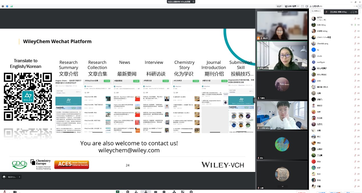 1月11日受我??萍继?、化學(xué)與化工學(xué)院邀請(qǐng),Wiley期刊編輯葉夢(mèng)陽博士和林瑤博士做客我?!扒把乜茖W(xué)報(bào)告”,為我校師生帶來題目為“Publishing with Wiley Chemistry Journals”的線上報(bào)告?;W(xué)院相關(guān)教師參加了此次報(bào)告。