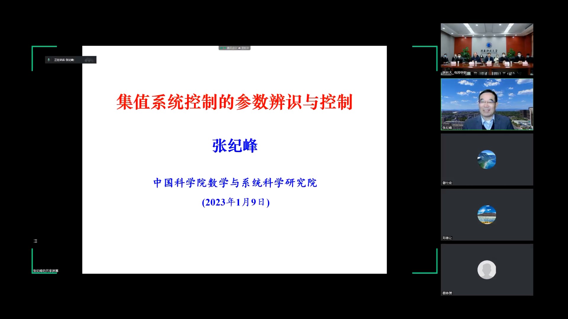 近日,受電氣與控制工程學院邀請,中國科學院數(shù)學與系統(tǒng)科學研究院研究員張紀峰教授做客我校“前沿科學報告”,作了題為“集值系統(tǒng)控制的參數(shù)辨識與控制”的線上學術報告。黃劍鋒副校長、電控學院黨委書記喬明哲、院長湯偉、學術骨干和部分教師代表在逸夫樓406會議室出席了此次會議,全校師生210余人線上參會,會議由電控學院院長湯偉主持。