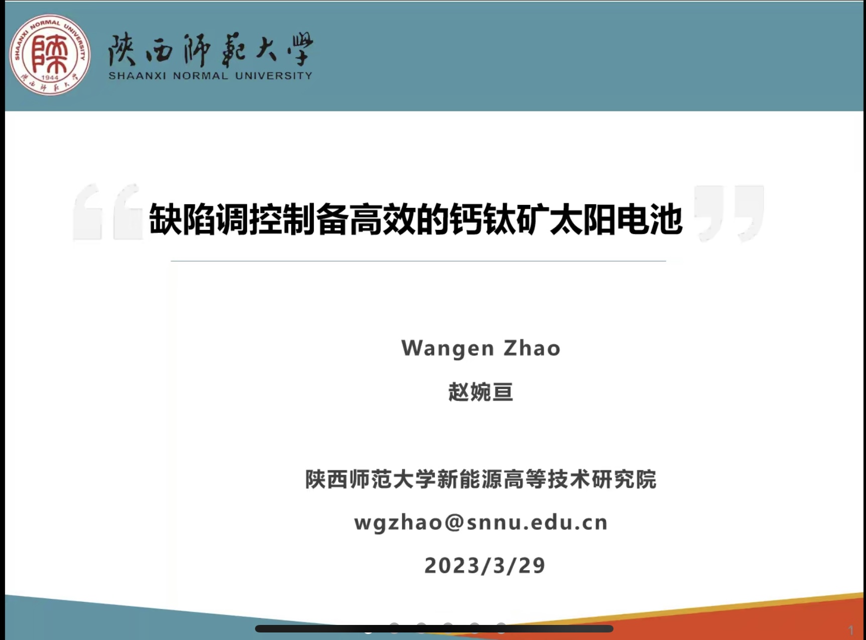3月29日,應(yīng)柔性電子學(xué)院和研究生院邀請(qǐng),陜西師范大學(xué)趙婉亙副研究員做客我?!拔囱雽?dǎo)師論壇”,作了題為“缺陷調(diào)控制備高效率鈣鈦礦太陽(yáng)電池”的學(xué)術(shù)報(bào)告。報(bào)告由柔性電子學(xué)院副院長(zhǎng)劉國(guó)棟主持,相關(guān)專業(yè)教師和研究生參加了此次報(bào)告。