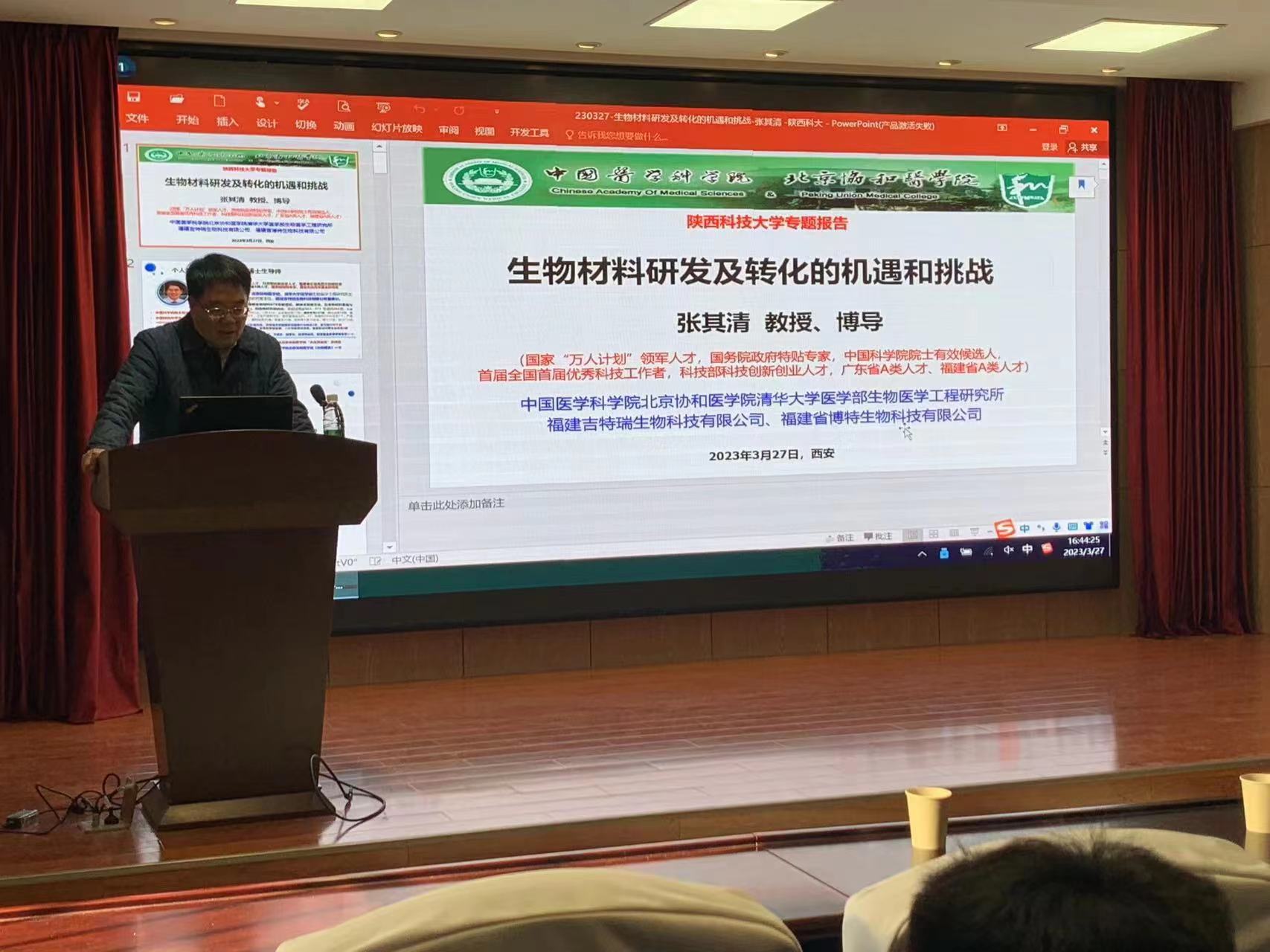 3月27日,應我校輕工科學與工程學院(柔性電子學院)、科技處及前沿院邀請,中國醫(yī)學科學院、北京協(xié)和醫(yī)學院、清華大學醫(yī)學部張其清教授做客我?!扒把乜茖W報告”,為我校師生帶來一場題為“生物材料研發(fā)及轉(zhuǎn)化的機遇和挑戰(zhàn)”的學術報告。報告會由輕工學院陳詠梅教授主持,我校相關專業(yè)師生近百人參加了此次報告會。