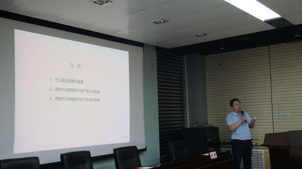 報(bào)告會上,蔡鵬首先介紹了西安軟件園基本情況和園區(qū)產(chǎn)業(yè)布局;并結(jié)合個(gè)人職業(yè)發(fā)展經(jīng)驗(yàn),從西安IT產(chǎn)業(yè)企業(yè)情況、IT人才圈層與鏈接、IT產(chǎn)業(yè)紅利及人才紅利變化、就業(yè)市場觀察等方面對行業(yè)需求變化趨勢進(jìn)行了全面的分析講解;最后介紹了IT業(yè)界視野下的產(chǎn)學(xué)合作策略、本科人才培養(yǎng)模式、雙師型教師培訓(xùn)等方面的內(nèi)容。