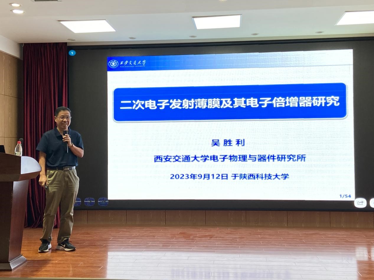 9月12日上午,應(yīng)我校輕工科學(xué)與工程(柔性電子)學(xué)院、科技處及前沿院邀請(qǐng),西安交通大學(xué)電子物理與器件研究所吳勝利教授做客我校“前沿科學(xué)報(bào)告”,作了題為“二次電子發(fā)射薄膜與其電子倍增器研究”的學(xué)術(shù)報(bào)告。報(bào)告會(huì)由輕工學(xué)院院長(zhǎng)助理游翔宇主持,學(xué)院相關(guān)專業(yè)教師、研究生參加了此次報(bào)告會(huì)。