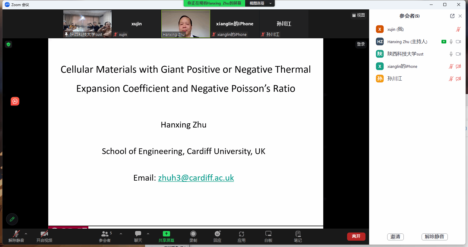 11月27日,應(yīng)科技處與機(jī)電工程學(xué)院(智能制造與機(jī)器人工程學(xué)院)邀請(qǐng),英國(guó)卡迪夫大學(xué)朱漢興教授做客我校“前沿科學(xué)報(bào)告”,作了題為“Cellular Materials with Giant Positive or Negative Thermal Expansion Coefficient and Negative Poisson’s Ration”的學(xué)術(shù)報(bào)告。報(bào)告會(huì)由機(jī)電學(xué)院李晨教授主持,機(jī)電學(xué)院副院長(zhǎng)楊立軍教授、微納機(jī)電研究所老師和部分研究生參加報(bào)告。