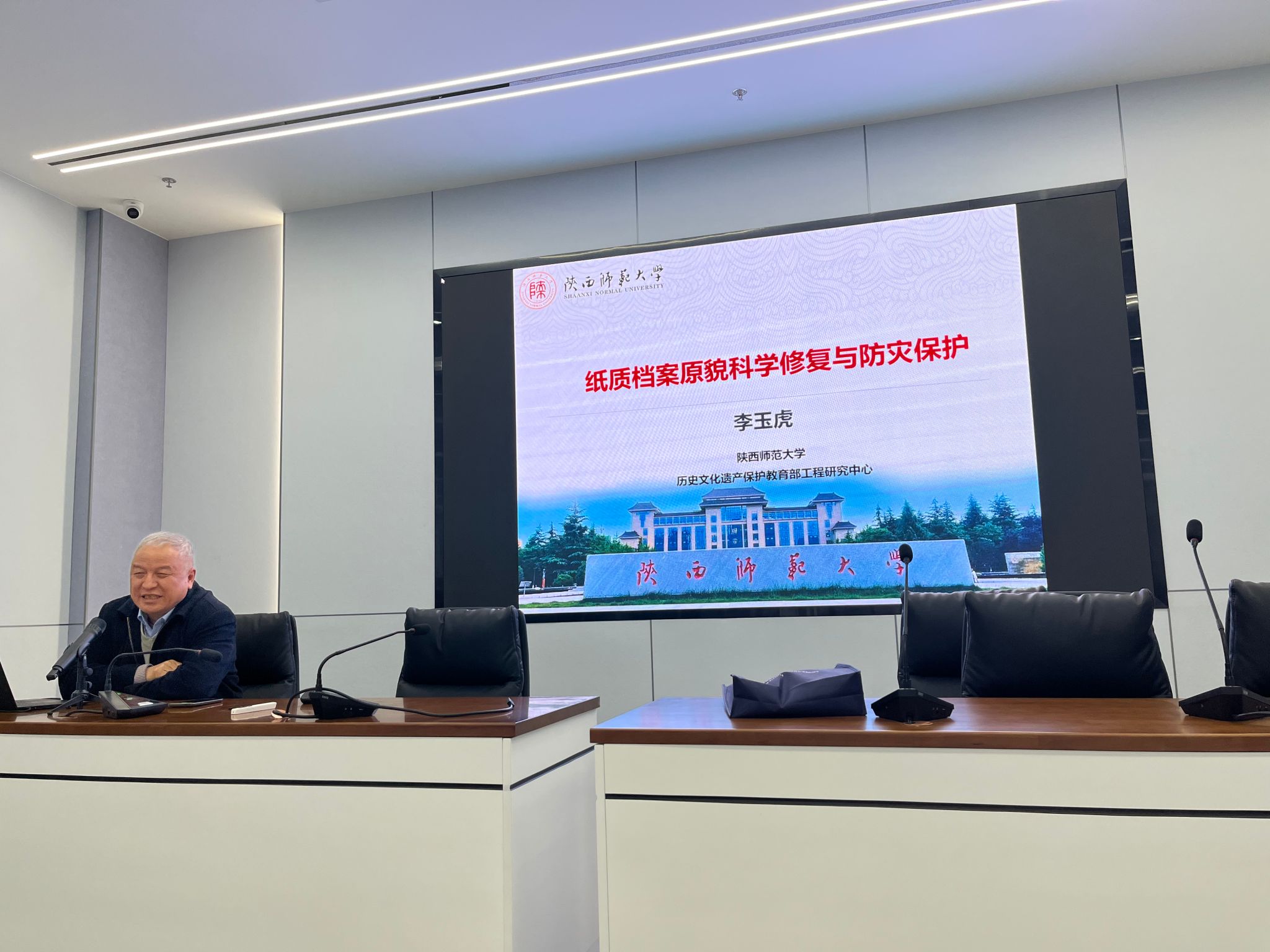 李玉虎教授以科技創(chuàng)新驅(qū)動(dòng)守護(hù)中華文脈為引子,強(qiáng)調(diào)了紙質(zhì)文物保護(hù)的重要性與緊迫性。詳細(xì)講解了紙質(zhì)檔案原貌科學(xué)修復(fù)與防災(zāi)保護(hù)技術(shù)、整卷檔案、整本圖書氣相脫酸與加固關(guān)鍵技術(shù),最后介紹了環(huán)保型防災(zāi)耐久抗疫檔案盒與封存箱的研發(fā)歷程。