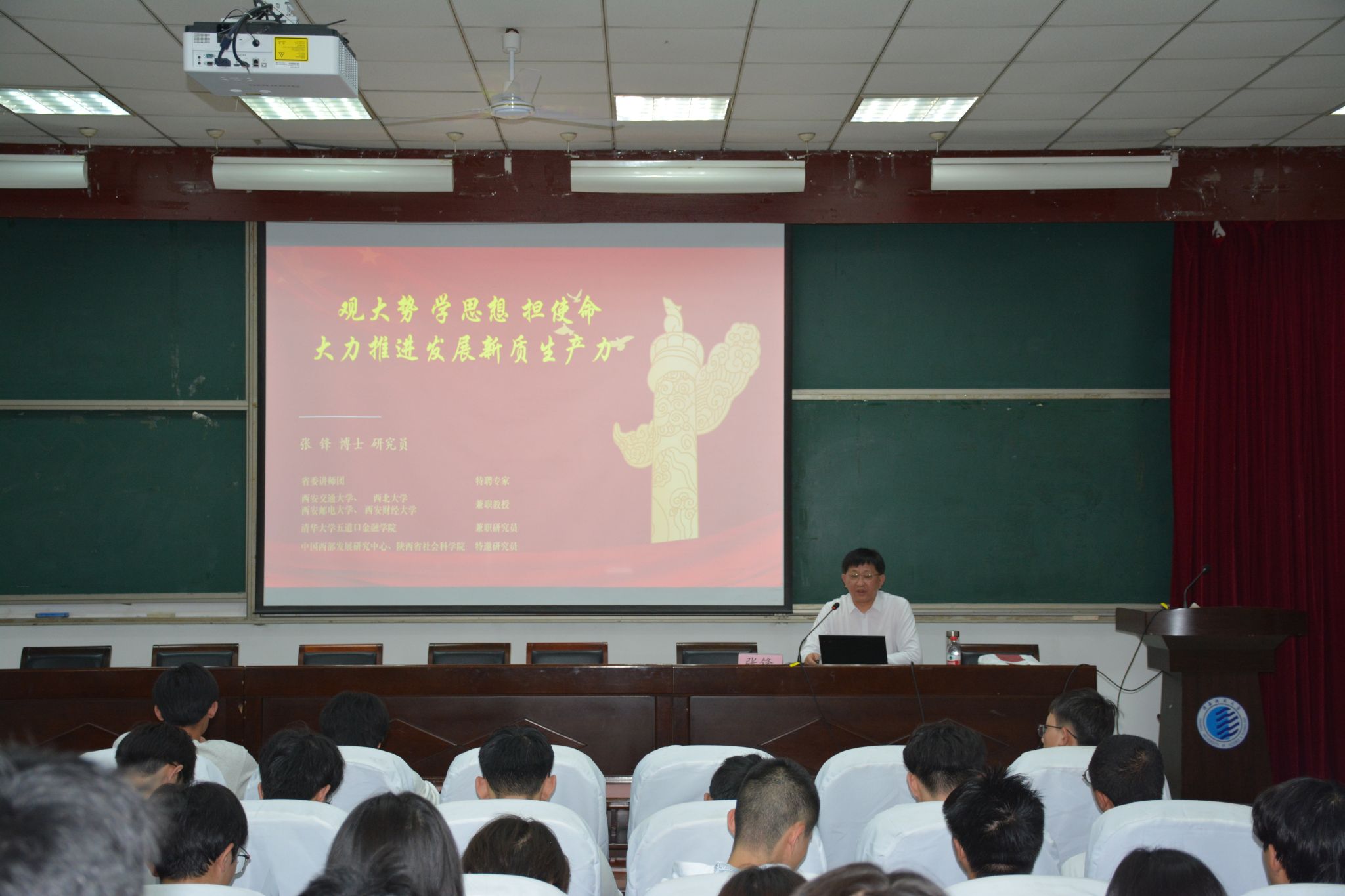 5月10日,應(yīng)我校馬克思主義學(xué)院邀請,陜西省委理論講師團特聘專家張鋒研究員做客“至博大講堂”,為廣大師生帶來一場題為“觀大勢 學(xué)思想 擔(dān)使命 大力推進發(fā)展新質(zhì)生產(chǎn)力”的精彩報告。報告由馬院院長吳明永主持,思政課教師代表、馬克思主義理論碩士研究生以及部分本科生參加報告會。