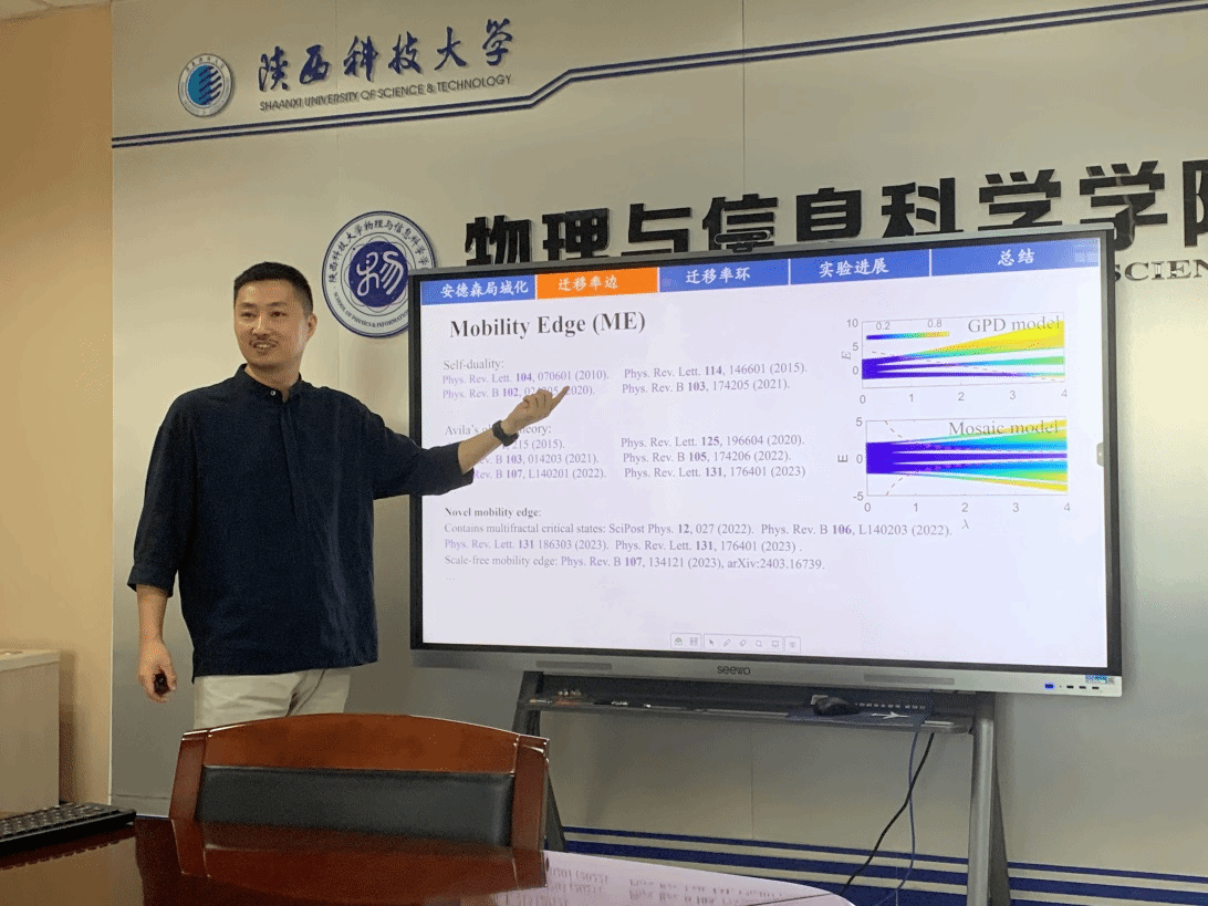 報(bào)告會上,李志副教授首先向與會師生介紹了安德森局域化的物理意義和內(nèi)涵,從而引出了固體物理中遷移率邊的概念。接下來從理論上解釋了遷移率邊出現(xiàn)的原因以及實(shí)際物理系統(tǒng)中有關(guān)遷移率邊的實(shí)驗(yàn)研究。李志副教授團(tuán)隊(duì)在傳統(tǒng)厄密系統(tǒng)的遷移率邊概念的基礎(chǔ)上,考慮非厄密物理系統(tǒng)中遷移率邊的新特性,提出了遷移率環(huán)的概念。李志副教授團(tuán)隊(duì)堅(jiān)持理論與實(shí)驗(yàn)相結(jié)合開展研究工作,他隨后向大家介紹了華南師范大學(xué)超冷原子物理團(tuán)隊(duì)驗(yàn)證理論結(jié)果所搭建的實(shí)驗(yàn)平臺,以及目前的一些研究進(jìn)展。