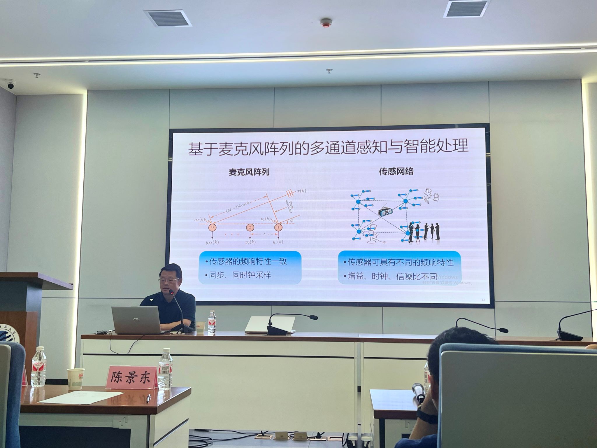 聲信號獲取與處理技術(shù)是語音通信和人機語音交互的基石。在本次報告中,陳景東教授首先介紹了日常生活中的常見噪聲類型,及遠程會議、錄音擴放、智能家居、智能座艙等領(lǐng)域的應(yīng)用場景,并從單通道語音信號處理的局限性引出了多通道語音信號處理任務(wù),指出了下一代拾音系統(tǒng)不僅需要獲取來自某些聲源的聲信號,也需要感知傳感器周圍的聲場信息,以實現(xiàn)場景檢測、聲事件分類、識別與解譯等任務(wù)。報告中,陳景東教授就聲信號獲取、聲場感知技術(shù)的進展,以及多通道聲場感知與智能處理領(lǐng)域所面臨的主要挑戰(zhàn)等問題作了深入淺出地介紹。報告結(jié)束后,陳景東教授認真詳細的回答了現(xiàn)場老師和學生的問題。