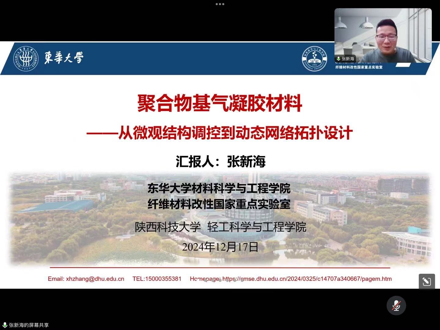 12月17日,應(yīng)輕工科學(xué)與工程學(xué)院(柔性電子學(xué)院)和研究生院邀請,東華大學(xué)纖維材料改性國家重點實驗室副研究員張新海做客我校“未央導(dǎo)師論壇”,作了題為“聚合物基氣凝膠材料—從微觀結(jié)構(gòu)調(diào)控到動態(tài)網(wǎng)絡(luò)拓?fù)湓O(shè)計”的線上學(xué)術(shù)報告,輕工學(xué)院相關(guān)專業(yè)教師、研究生及本科生參加了本次報告會。