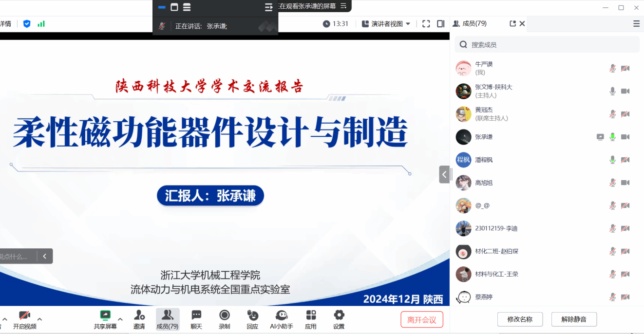 12月18日下午,應(yīng)輕工科學(xué)與工程學(xué)院(柔性電子學(xué)院)和研究生院邀請,浙江大學(xué)張承謙副研究員做客我校 “未央導(dǎo)師論壇”,作了題為 “柔性磁功能器件設(shè)計(jì)與制造”的線上學(xué)術(shù)報(bào)告。輕工學(xué)院相關(guān)專業(yè)教師、研究生及本科生參加了本次報(bào)告會(huì)。