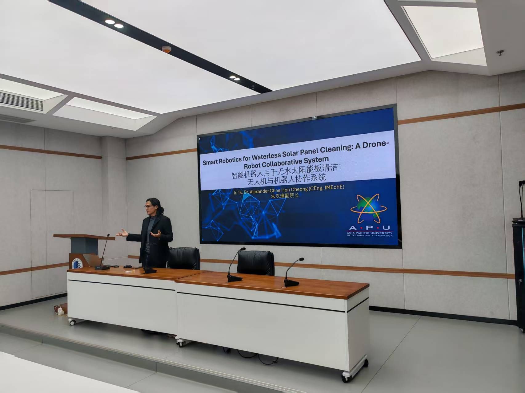 6月19日,應(yīng)我校國際合作與交流處、機(jī)電工程學(xué)院(智能制造與機(jī)器人工程學(xué)院)邀請,馬來西亞亞太科技大學(xué)(APU)工程學(xué)院副院長Alexander Chee Hon Cheong教授來陜西科技大學(xué)訪問交流,并做題為“Smart Robotics for Waterless Solar Panel Cleaning: A Drone-Robot Collaborative System”的學(xué)術(shù)報告。機(jī)電工程學(xué)院副院長袁越錦教授、機(jī)器人教研室教師和研究生參加了本次報告會。