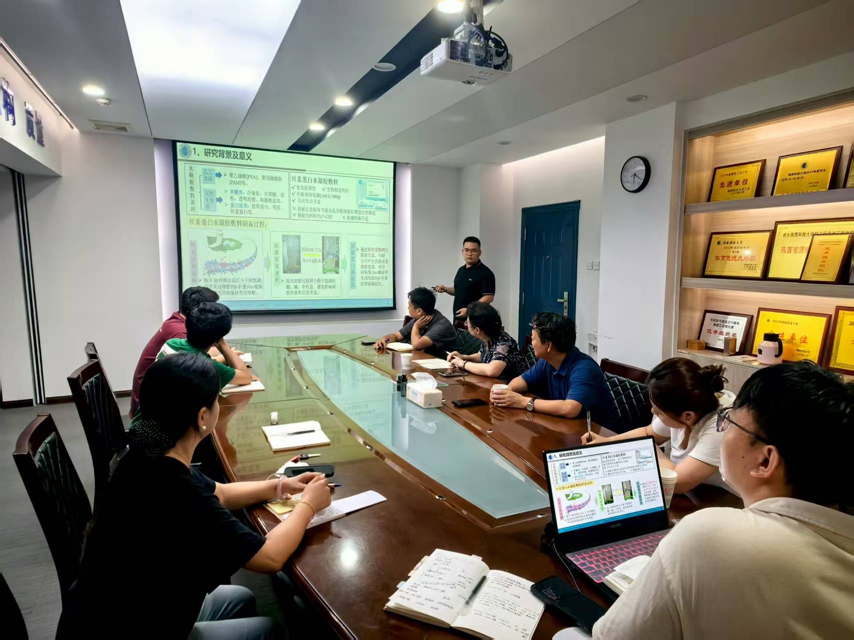 報(bào)告中,邢孟秋系統(tǒng)闡述了如何利用先進(jìn)的水凝膠與納米材料技術(shù),針對(duì)消化系統(tǒng)疾病(如胃腸道修復(fù)、止血、藥物遞送等)開(kāi)發(fā)創(chuàng)新性的診斷和治療策略。重點(diǎn)介紹了這些智能生物材料在組織工程、新型生物膠水、高效止血材料以及3D生物打印構(gòu)建復(fù)雜組織等方面的突破性進(jìn)展,并展望了可植入柔性電子傳感器在消化道健康監(jiān)測(cè)與管理中的巨大潛力。邢孟秋教授與現(xiàn)場(chǎng)師生就報(bào)告內(nèi)容展開(kāi)了深入的互動(dòng)交流,使大家對(duì)水凝膠和納米材料的研究和發(fā)展趨勢(shì)有了更深刻的認(rèn)識(shí),開(kāi)闊了師生們的學(xué)術(shù)視野和研究思路。