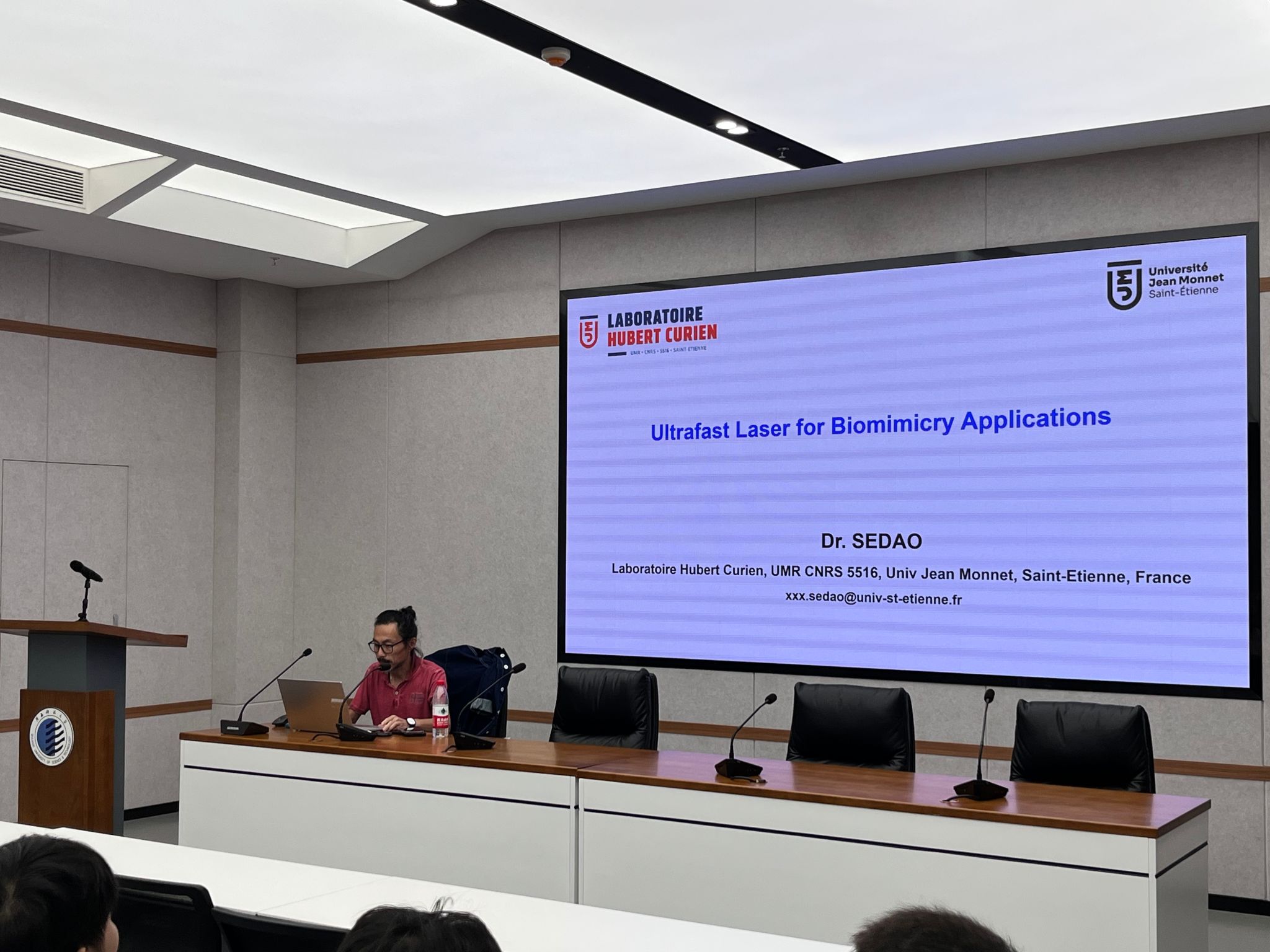 9月1日的報告中,SEDAO教授以“Ultrafast Laser Processing: Applications Overview”為題,系統(tǒng)講解了超高速激光脈沖與材料的相互作用機(jī)制、表面功能化技術(shù)及工業(yè)化應(yīng)用路線,解析了核心技術(shù)原理與落地路徑,并結(jié)合增材制造、生物醫(yī)學(xué)等實例,展現(xiàn)了超快激光的廣泛應(yīng)用潛力。3日,他以“Ultrafast Laser for Biomimicry Applications”為題,圍繞仿生學(xué)展開,闡述了仿生學(xué)理念,介紹了自然啟發(fā)表面的功能特性及超快激光紋理化技術(shù),還解析了眼科生物源材料中激光與材料的相互作用等內(nèi)容。5日的“Pulsed-Laser for Direct Coloration of Metals”報告,闡述了激光與物質(zhì)相互作用原理、金屬表面顏色呈現(xiàn)(含結(jié)構(gòu)色與色素色的區(qū)別)及相關(guān)加工工藝,通過光捕獲黑色表面等實例體現(xiàn)了應(yīng)用價值。每場報告中,教授都與師生深入交流,解答技術(shù)難點(diǎn),引導(dǎo)多學(xué)科交叉思考,幫助師生了解前沿動態(tài),對提升學(xué)校相關(guān)領(lǐng)域國際化交流層次意義重大。